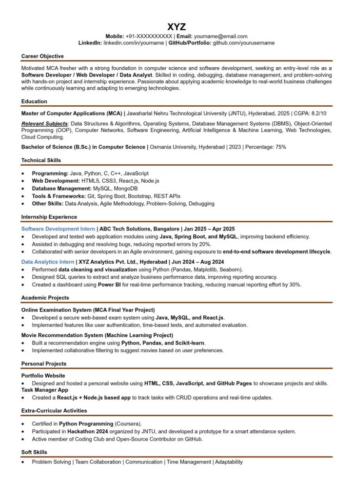 - Keep the MCA Fresher Resume concise—ideally one page.